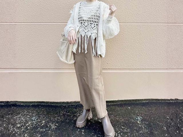 ベージュ系の淡色トーンでまとめたコーデは、ニット素材が季節感をプラス。レインブーツが全体を引き締めつつ、足元にほどよいボリュームを出してくれます。雨の日はもちろん、晴れの日のブーツスタイルとしても使える万能さが魅力です。