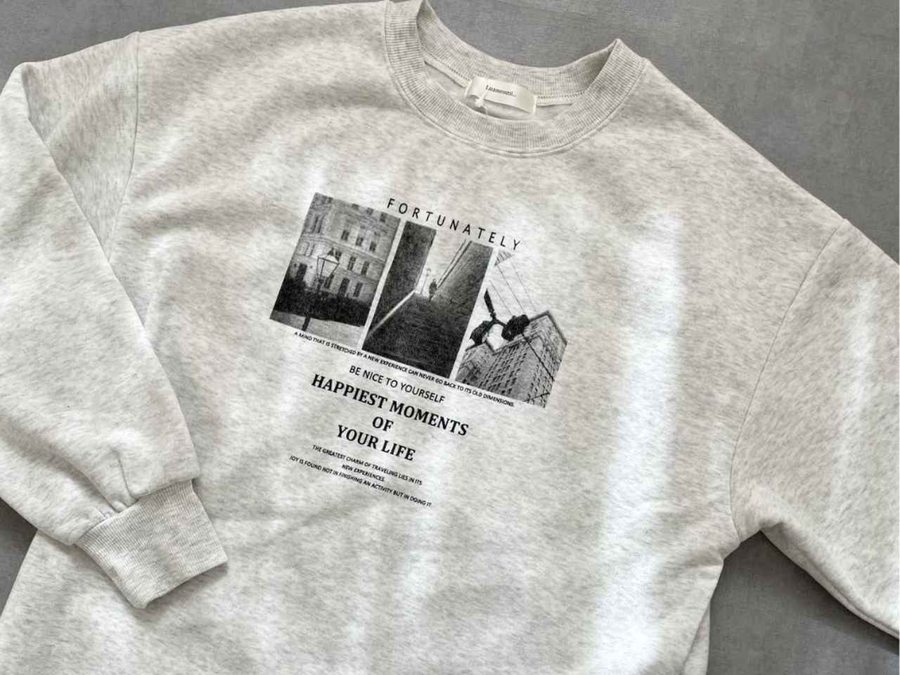 購入したのはこちらのスウェットトップス。冬に使いやすい明るめの杢グレーに、大人っぽいロゴとさりげないフォトプリントが使いやすい1枚。