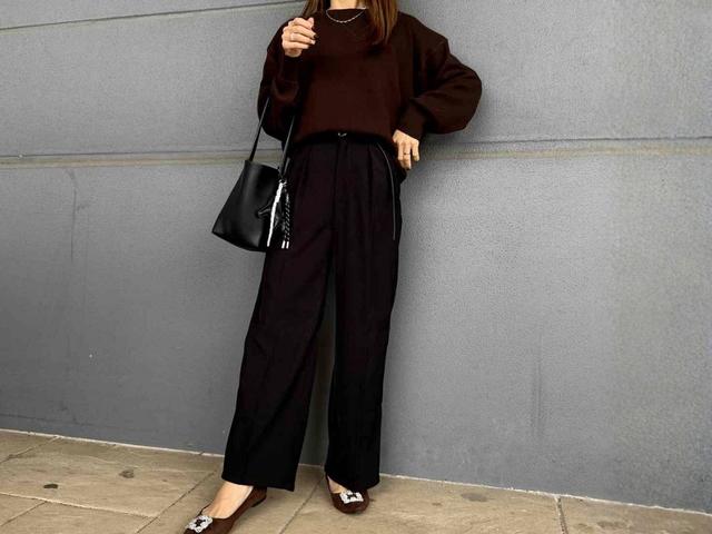 【ユニクロ】の「スムースコットンクルーネックセーター」を合わせました。パンプスもブラウンで合わせたので、キレイめコーデになります!