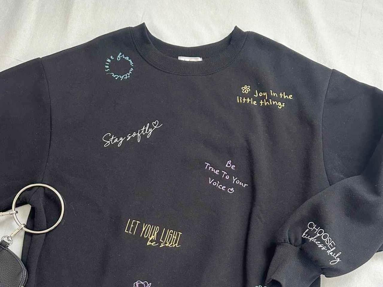 ランダムにメッセージやカラーの違う刺繍がされているスウェットが、可愛すぎました! プリントではなく刺繍なところも、ものすごく高見えです。着回しコーデも紹介します。