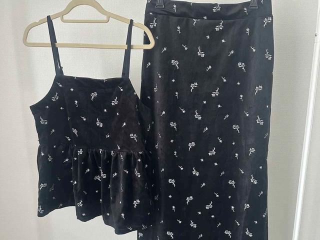 【しまむら】で購入した、花柄刺繍のビスチェとスカートです。光沢感が高見えするベロア素材で、花柄と相まってとても上品な印象です。