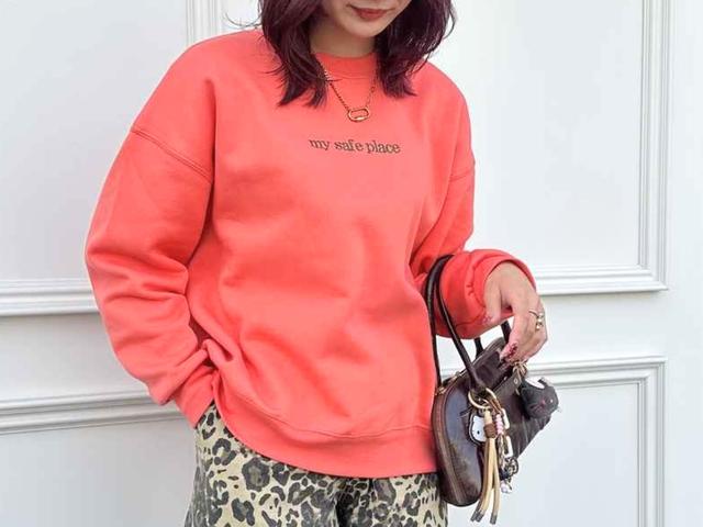 レオパードパンツと合わせた、ラフだけどおしゃれ見えする大人の抜け感コーデです。ゆるゆるシルエットでも、色や柄でメリハリがついて◎