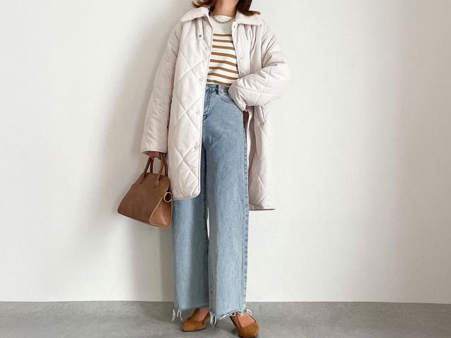 絶妙な丈感なので、ワンピースとの相性も抜群! シルエットがキレイなアウターなので、キルティングでもカジュアルらしさは軽減され、女性らしい雰囲気にもピッタリ♡