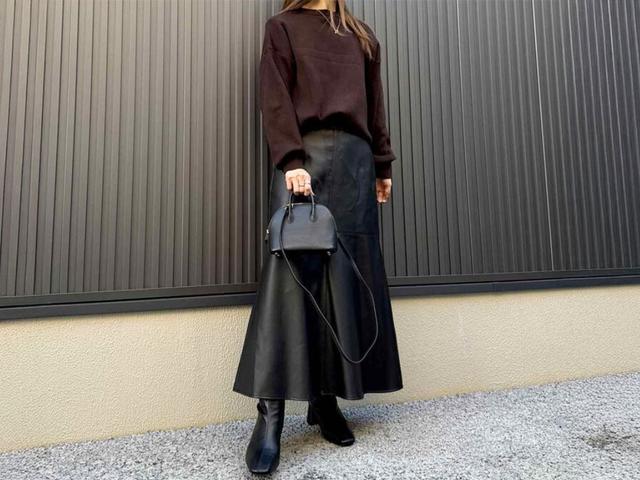 【ユニクロ】の「スムースコットンクルーネックセーター」と、レザースカートのコーディネートに合わせました。バッグもブラックで合わせたので、カッコいい雰囲気になります♪