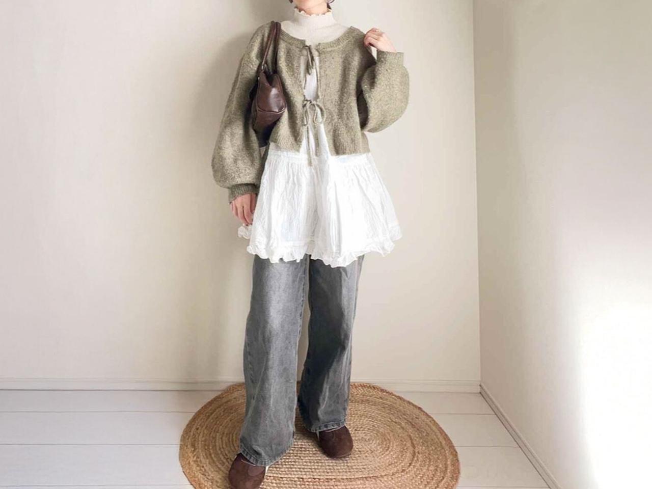 ニットにキャミワンピースをレイヤードしたスタイルは、かわいさとラフさのバランスがポイント。足元にスニーカーを合わせることで、甘くなりすぎず、ほどよく力の抜けた印象に仕上がります。重ね着を楽しみたい日におすすめのコーディネートです。