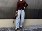 ニットにタックパンツを合わせたスタイル。全体を同系色でまとめることで、スニーカーを合わせてもカジュアルになりすぎず、落ち着いた雰囲気に仕上がります。ラフさの中にきちんと感もあるコーディネートです。