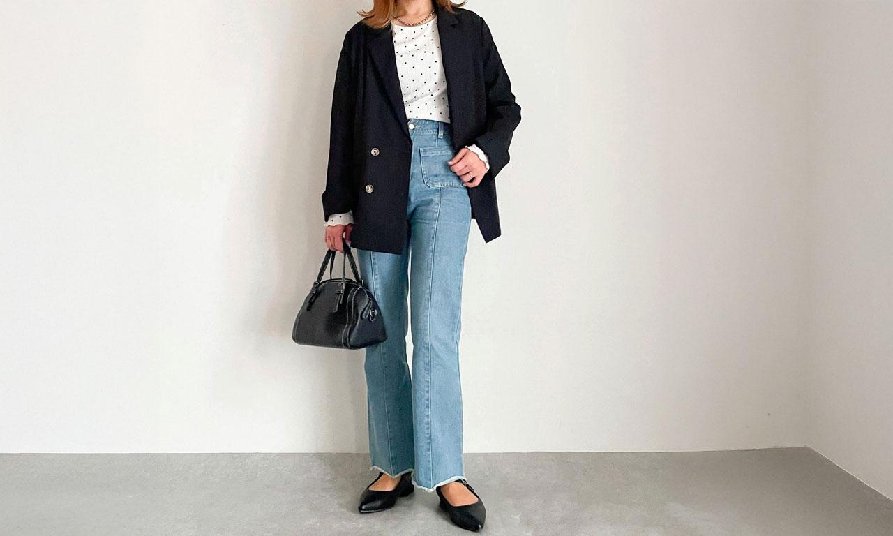 甘さを抑えたいなら、ジャケットスタイルでハンサムに♡ デニムでカジュアルダウンしつつも、キレイめ要素は残して。