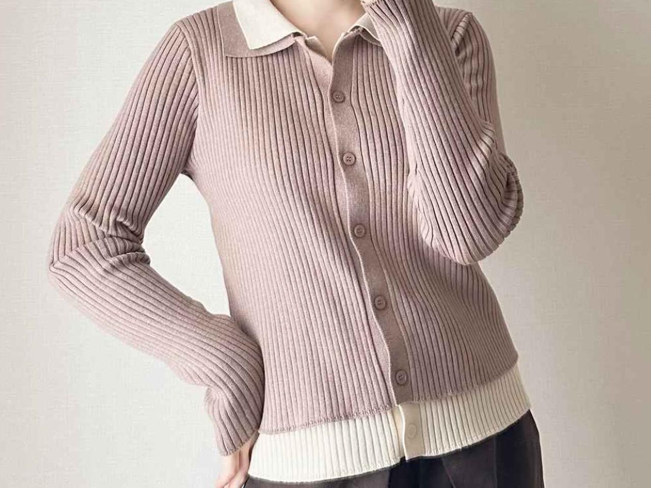 襟元と裾からのぞくカラーのコントラストが目を惹き、コーディネートに奥行きを生み出してくれます。縦ラインを強調するリブ素材は、すっきり見えしつつも柔らかな印象に。