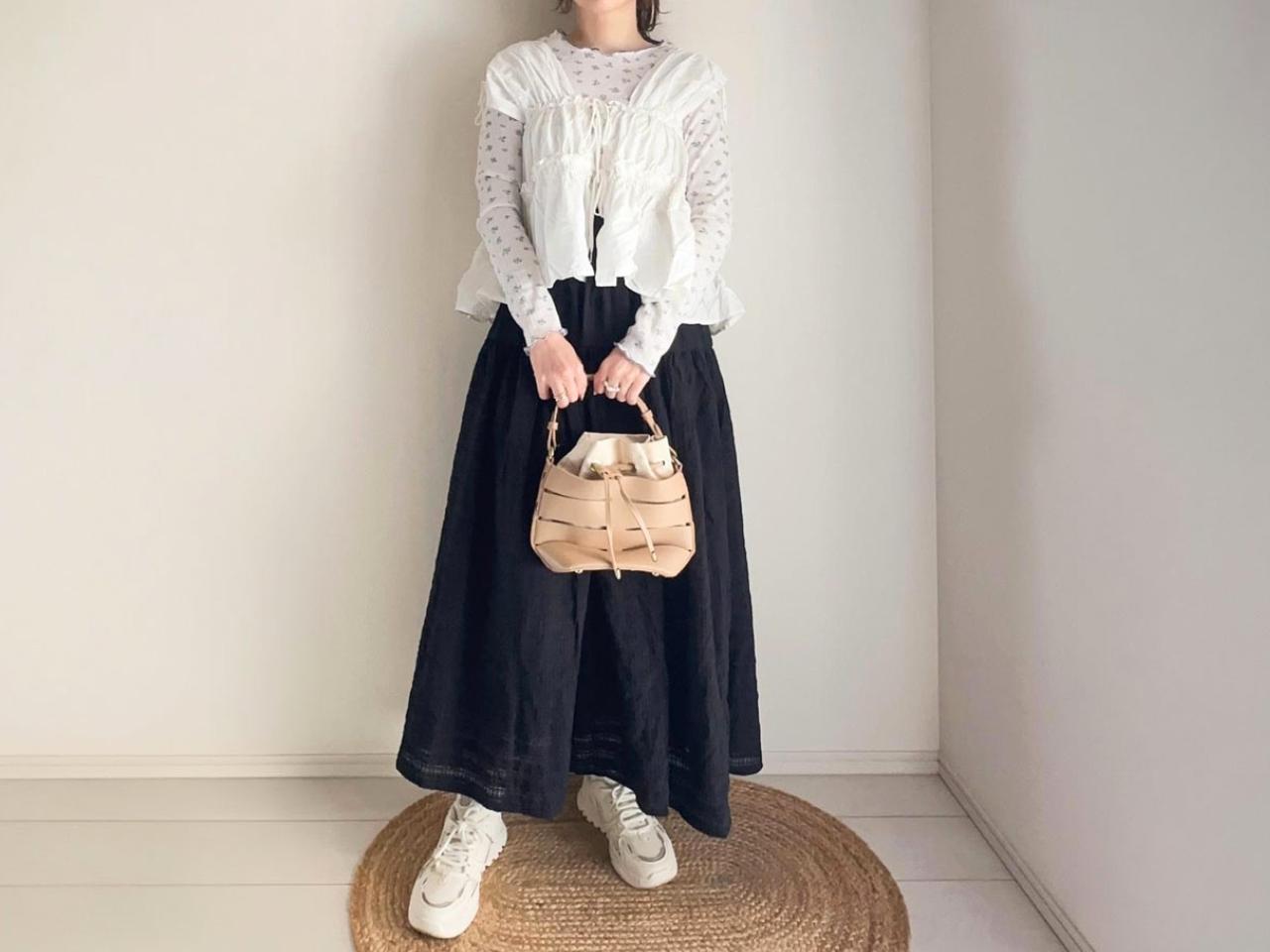 シアートップスを合わせた、抜け感のあるモノトーンスタイル。ブラックのティアードスカートがコーディネート全体を引き締めつつ、軽やかなシアートップスで重たく見えないバランスに仕上がります。