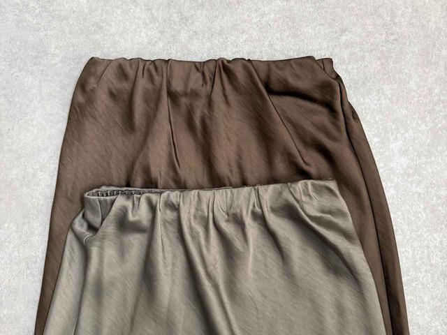 広がりすぎず、シルエットがキレイなサテンスカート。カーキもブラウンもどちらも絶妙なカラーなんです!