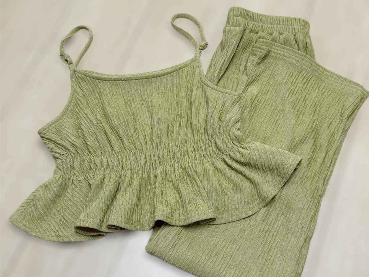 全体的に絞り感のある素材で伸縮性があり、洗濯しても形は変わらず形状記憶のような万能セットアップです。生地にはポリエステルが使われており、アイロンいらずで楽ちんでした!
