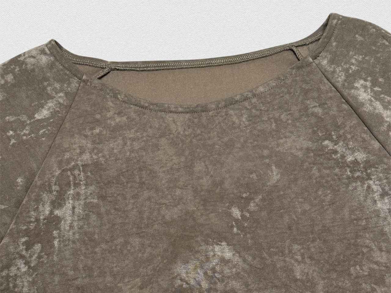 襟ぐりは広がりすぎず、ほどよく開いた絶妙なバランス。鎖骨が隠れるか隠れないかの絶妙ラインで上品さと抜け感を両立しています。女性らしさも感じられるこだわりのネックデザインです。