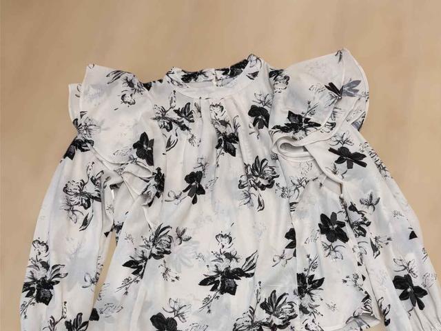 やわらかなホワイトベースに、ブラックのフラワープリントが上品な印象のブラウスです。落ち着いたカラーづかいなので甘くなりすぎず、大人っぽく着こなせる一枚。