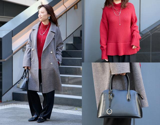 『ブラウンをベースにした、ミックス感が可愛いヘリンボーン柄のロングコート。かっちりコートは腕が上げづらいことも多いですが、このコートは軽くてストレッチも効いているので、肩の可動域がすごく広いんです! 今日はインが赤いハイネックニットなのでこの着こなし方ですが、襟を立ててもOKな2wayデザイン。スタンドカラーになるのでマフラーいらずです。着るタイミングの多いアウターこそ、着回し力が必要ですよね」