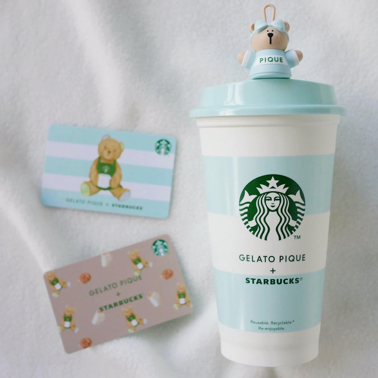 優しいカラーに癒されそうな「gelato pique ボーダーリユーザブルカップ ミントグリーン 473ml + ベアリスタキャップ」。ジェラピケらしいボーダー柄が印象的なカップと、ヘアバンドをつけたベアリスタのキャップがセットになっています。インスタグラマーの@j.u_u.n__starbucksさんは「うしろ姿もキュートで愛おしい 」「一目でジェラピケってわかるのも好き」とお気に入りの様子。お店ではもちろん、オフィスで使っても注目の的になりそう!