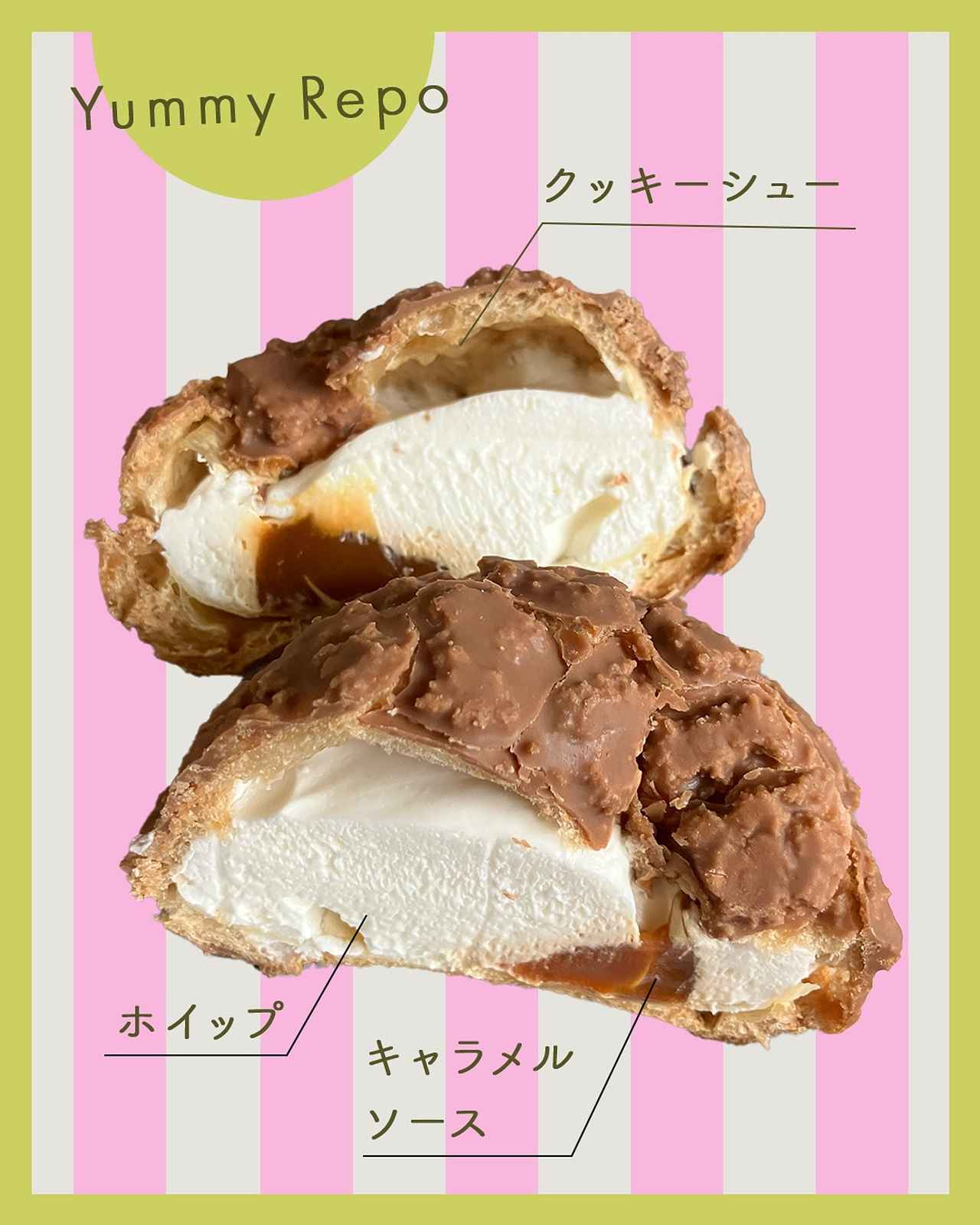 ゴツゴツとした表面が印象的な「Uchi Café × MERCER bis 生キャラメルクッキーシュー」。公式サイトでは、キャラメルコーティングしたクッキーシュー生地に、ホイップクリームとキャラメルソースが入った一品と紹介されています。インスタグラマーの@oyatsu_panponさんは「クッキーシューの食感がガリザク」で、「キャラメルはほろ苦く、ホイップとの相性も抜群」とコメント。ホイップには北海道産生クリームが使用されているとのことで、ほろ苦キャラメルと合わせて本格的な味わいが楽しめそうです。
