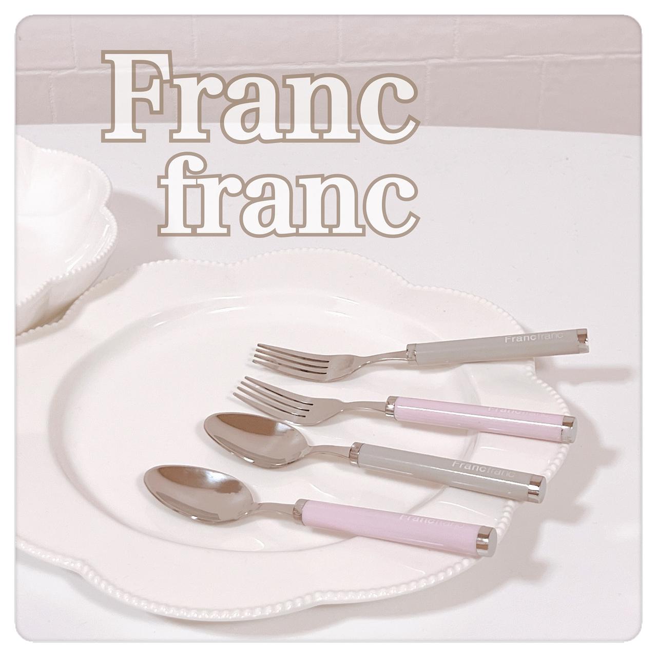 スプーン・フォーク・ティースプーン・ケーキフォークのカトラリーセット。カラー展開はグレー・ピンク・パープルです。カトラリーが揃っているとテーブルコーディネートがぐっと華やかになるので、セットでの購入がおすすめ。Francfranc好きの@risa_.pianoさんは「おうちごはんが