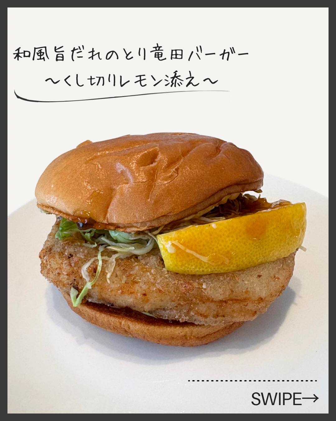 まずご紹介するのは「和風旨(うま)だれのとり竜田バーガー 〜くし切りレモン添え〜 ¥470(税込)」。サクッと揚げたとり竜田に、黒酢を使った和風だれを合わせた一品です。